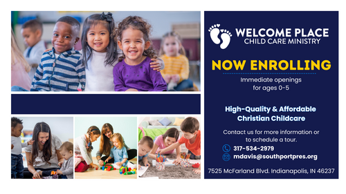 Southport Presbyterian Church offers full-time childcare at its Welcome Place Child Care Ministry for children from 6 weeks to 5 years, open from 6:30 AM to 5:30 PM. We aim to be a place that nurtures young minds and supports growing families.
